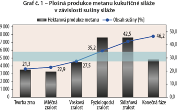 Na grafe č.1 je zobrazená produkcia metánu v závislosti na fyziologickej zrelosti porastu kukurice pri zbere. Najvyšších produkciou je dosahované u porastov s rozmedzím sušiny 35-42%. Zo skúseností pestovateľov možno odporučiť vyššiu sušiny. U BPS nedochádza k zníženiu stráviteľnosti škrobu ako u dobytka a zníženie stráviteľnosti vlákniny je v uvedenom rozmedzí minimálnej a možno ju eliminovať prevádzkovými opatreniami na BPS.