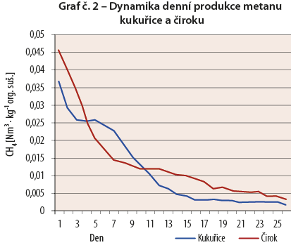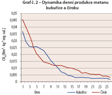 Za štandardného vývoja počasia počas vegetačnej sezóny je plošná produkcia metánu ciroku v dôsledku nižšieho výnosu sušiny o cca 30% nižšie ako kukurica pozri graf č. 3.