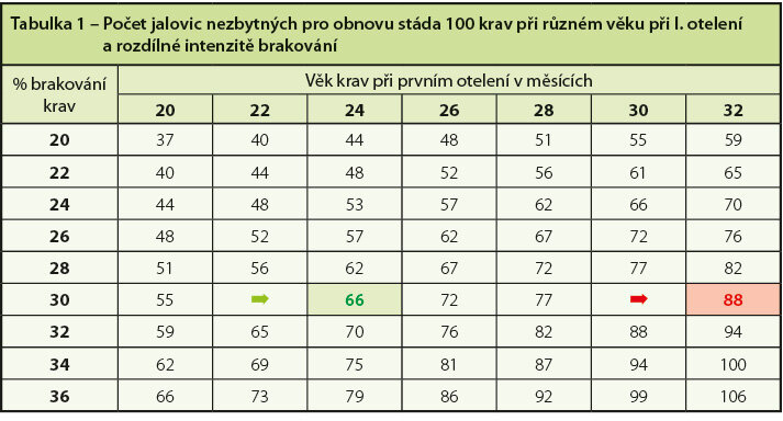 V tabuľke 1 je uvedené porovnanie počtu jalovíc nutný k prirodzenej obnove stáda s veľkosťou 100 kráv, a to pri ich rôznom veku pri prvom otelení a rozdielne intenzite brakovanie. Napríklad, pri 30% brakovanie v stáde a veku jalovíc pri prvom otelení 24 mesiacov, chovateľ potrebuje pre obnovu stáda minimálne 66 jalovíc. Pri rovnakej intenzite brakovanie, ale telenie jalovíc až vo veku 32. mesiacov, potrebuje chovateľ k obnove stáda už 88 jalovíc. Rozdiel medzi oboma príkladmi je 22 jalovíc, ktoré by mohli byť predané (22 jalovíc × 28 000 Sk = 616 000 Sk).