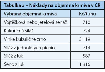 Ak odrátame od celkových ročných nákladov na kravu vo výške 74 701 Sk náklady na vedľajšie výrobky (5 460,40 Sk), a ďalej tržby za predané mlieko a priame dotácie na kravu a rok (tj. 74 760,60 € a 6 767, 10 Sk), potom ročný zisk na kravu v našom výberovom súbore dosahoval 12287,10 Sk, čo predstavuje prepočítaný zisk vo výške 33,66 Sk na kŕmny deň a 1,431 Sk na kg predaného mlieka. Od roku 2011, kedy sa začal zber produkčných a ekonomických ukazovateľov v stádach dojeného dobytka našimi poradcami, ide o druhý najlepší výsledok. Prehľad vývoja nákladov na výrobu mlieka v rokoch 2015 až 2019 je uvedený v tabuľke 2. Najvýznamnejšou nákladovou položkou v chove kráv, resp. dojníc predstavujú náklady na krmivá vlastné a nakúpená (42,8% z celkových nákladov). Priemerný podiel vlastných a nakúpených krmív, a to z celkových nákladov na krmivá, bol 58,9%, resp. 41,1%. Náklady na krmivá vlastné sa na celkových nákladoch na krmivá podieľali 17,6% až 93,3%, zatiaľ čo náklady na krmivá zakúpené potom 6,7% až 82,4%. V rámci nášho ekonomického sledovanie uvádzame v tabuľke 3 priemerné ceny vybraných objemových krmív, ktoré sú však iba orientačné, pretože naprieč podniky sú užívané bohužiaľ veľmi rozdielne metodiky oceňovania krmív. Vlastné krmiva by mala byť najlepšie každoročne oceňovaná na základe skutočnej znalosti nákladov vlastnej výroby. V mnohých chovoch sa používa metóda transferového oceňovania krmív, ktorú možno označiť v mnohých aspektoch za problematickú (podhodnotená / nadhodnotená cena krmív a stelív; cena krmiva / podstielky je v niekoľkých po sebe idúcich rokoch konštantný a neodráža reálne náklady produkcie príslušného roka).