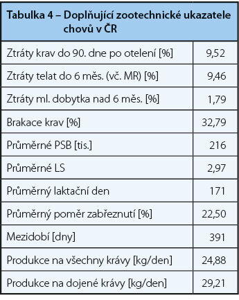 Mimo ekonomické aspekty výroby mlieka stojí za zmienku aj produkčné a reprodukčné ukazovatele chovu kráv. V rámci nášho monitoringu vybraných ukazovateľov stojí za zmienku straty kráv do 90. dňa po otelení, ktoré v roku 2019 boli v našom vzorke na úrovni 9,52% (tabuľka 4). Tento ukazovateľ je tiež jedným z efektívnych nástrojov hodnotenia zvládnutie periódy období státia na sucho u kráv. Odporúčané je evidovať straty kráv (celkové; do 50. resp. Do 90. dňa laktácie apod.) Podľa poradia laktácie, a to minimálne na úrovni prvotelek a kráv na druhé a ďalšie laktáciu. Ďalej bola sledovaná aj intenzita brakovanie kráv, ktorá bola na úrovni 32,79%. Z dát publikovaných ČMSCH (Ročenka chov dobytka v SR, 2020) vyplýva, že v roku 2019 bolo 74,6% kráv zapojených do KU odstavené zo zdravotných dôvodov, zatiaľ čo 25,4% zo zootechnických dôvodov. Podiel kráv, ktoré sú v chovoch vyraďované zo zdravotných dôvodov v posledných 10-ročný pozvoľna klesá (z 82,5% v roku 2009 na 74,6% v roku 2019), zatiaľ čo podiel kráv vyradených na základe zootechnických dôvodov narastá (z 17,5% v roku 2009 na 25,4% v roku 2019). Na tomto mieste spomeňme, že najmä prvotelky vyradené v priebehu prvej laktácie sú pre chovateľov značnou stratou, ktorú možno rozdeliť na stratu ekonomickú (náklady - odpisy) a chovateľskú (genetický pokrok, neprenesené genetického potenciálu z matky na viacerých potomkov pod.).