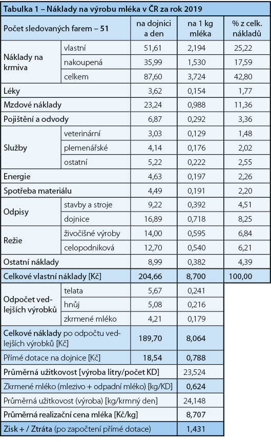 Celkové náklady v nami skúmanom súbore boli v roku 2019 na úrovni 74 701 Sk, tj. 204,66 Sk na kravu a deň, resp. 8,70 Sk / kg predaného mlieka. Najvyššia nákladovou položkou predstavovali náklady na krmivá (vlastné a nakúpená), a to na úrovni 87,60 Sk / deň a kravu (42,8% z celkových nákladov). Ďalšími významnými nákladovými položkami boli: a) mzdové náklady - 11,36% z celkových nákladov, b) réžia - 13,05% (z toho 52,4% predstavovali réžia živočíšnej výroby a 47,6% celopodnikové réžia), c) odpisy - 12,76% z celkových nákladov (z toho 35,3% predstavovali odpisy stavieb a strojov a 64,7% odpisy kráv). Kompletný zoznam nákladových položiek, ale aj kalkulácií tržieb, či už na kravu a kŕmny deň, alebo na kg predaného mlieka je uvedený v tabuľke 1.
