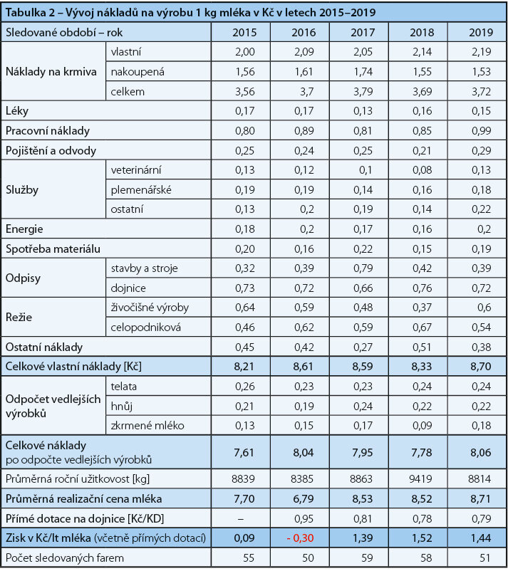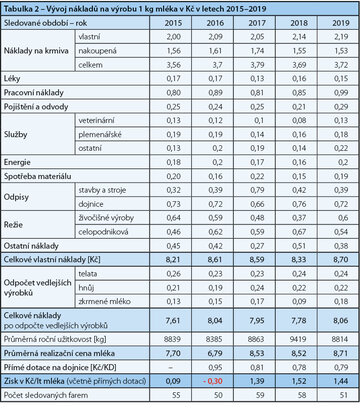 Pravidelné hodnotenia výrobných a ekonomických ukazovateľov je jedným z kľúčových nástrojov efektívneho riadenia poľnohospodárskych podnikov s chovom dojeného dobytka. V rámci rutinnej poradenskej činnosti sú aj našimi špecialistami, ktorí pôsobia v oblasti výživy dobytka, už mnoho rokov výrobné a ekonomické ukazovatele pravidelne získavané, hodnotené a porovnávané s podnikmi rovnakého produkčného zamerania a veľkosti. V roku 2019 sa nám podarilo získať produkčné a ekonomické dáta z 51 chovov dojeného dobytka naprieč ČR. Priemerná ročná produkcia mlieka na kravu bola v nami skúmanom súbore za sledované obdobie roku 2019 na úrovni 8 814 kg, zatiaľ čo trhovej produkcie potom 8 586 kg / kravu / rok (po odpočítaní produkcia kolostra, kŕmneho tranzitného mlieka a prípadne mlieka odpadového). Tržnost mlieka dosahovala 97,4%. Priemerná realizačný (nákupný) cena mlieka bola u hodnoteného súboru 8,71 Sk, čo zodpovedalo denným a ročným tržbám za predané mlieko 204,82 Sk, resp. 74 760,60 Sk na kravu. Ďalšie príjmovou položkou boli tiež priame dotácie na chov kráv, ktoré dosahovali priemerné vyššie 0,79 Sk / kg predaného mlieka, resp. 6 767,10 Sk / ustajnenú kravu za rok. Významnou položkou v kalkulácii nákladov výroby mlieka, sú odpočítateľné náklady na vedľajšie výrobky (narodené teľa, produkcia hnoja, konzumované za mlieko), ktoré dosahovali 5 460,40 Sk / kravu a rok.