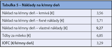 V posledných rokoch sa na hodnotenie príjmu finančných prostriedkov nad cenu krmiva používa ukazovateľ IOFC (tržby za mlieko znížené o náklady na krmivá), uvedený v tabuľke 5. Sledovaním tohto ukazovateľa vytvárame predpoklad na ekonomickú mliečnu produkciu, pričom je IOFC ovplyvnený cenou mlieka a cenou krmív. Cieľom je mať dostatok finančných prostriedkov na úhradu ostatných nákladov v chove dojníc. Prakticky sa od mesačných tržieb za mlieko odrátajú náklady na krmivá a rozdiel sa podelí kŕmnymi dňami všetkých dojníc za daný mesiac. Pre pokrytie všetkých ďalších nákladov (hranica rentability) je potrebných cca. 3,5–4 € na kŕmny deň.