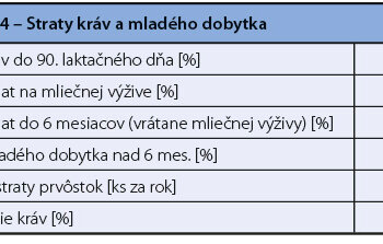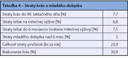 Údaje zoradené z posledných 5 rokov poukazujú, že sa jedná o ekonomicky úspešnejší rok, kde realizačná cena mlieka a priame dotácie výrazne pomohli znížiť stratu (tabuľka 2).Pre lepšiu predstavu o úrovni našich chovov sú v Tabuľke 4 uvedené straty kráv, prvôstok a MD. Najbolestivejšia je pre chovateľa strata kráv do 90. dňa laktácie a strata kráv na prvej laktácii. Pre dobrú ekonomiku výroby mlieka je potrebné tieto straty eliminovať na únosnú mieru, čo môže položku odpisu dojníc veľmi významne ovplyvniť.