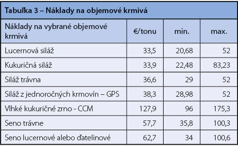 Percentuálne rozdelenie nákladov na krmivá tvorilo najväčšiu položku z celkových vlastných nákladov, a to až 38,4 % a podiel vlastných a nakúpených krmív je blízky k pomeru 1,87 : 1 (vlastné 25 % a 13,4 % nakúpené krmivá z celkovej štruktúry, resp. 65,1 %: 34,9 %). Tieto náklady sa podieľajú významnou mierou na celkových vlastných nákladoch pri výrobe mlieka.