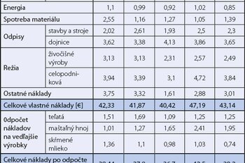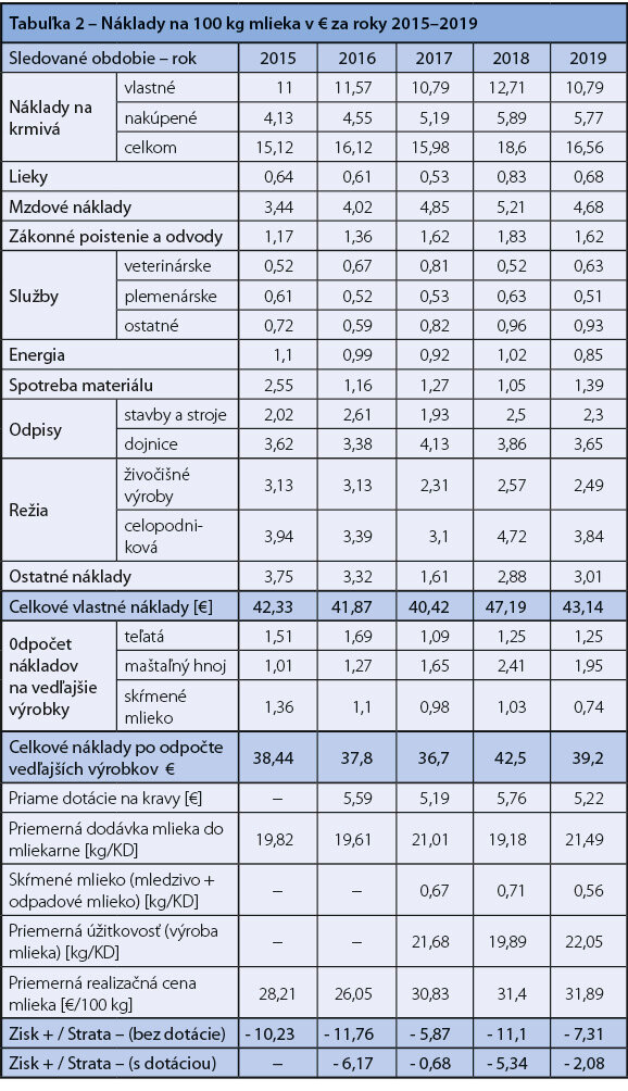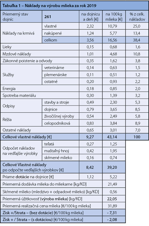 Priemerná veľkosť sledovaných chovov v roku 2019 (tabuľka 1) predstavovala 261 dojníc s priemernou dodávkou mlieka 21,49 kg na kravu s realizačnou cenou 0,3189 €/kg mlieka. Celkové vlastné náklady na kravu dosiahli úroveň 9,27 €/kŕmny deň, resp. 0,4314 € na kg predaného mlieka. Celkové vlastné náklady po odpočte vedľajších výrobkov sa znížili na 8,42 €/kravu a na 0,3920 €/kg mlieka. Poľnohospodárske podniky dosiahli stratu 0,0731 € na kg mlieka. Zarátaním priamych dotácii vo výške 0,0522 €/kg mlieka sa výrazná strata mierne znížila, ale stále bola v zápornom salde -0,0208 €/kg mlieka.