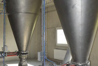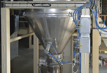 Pod miešačkami sú nerezové expedičné zásobníky, z ktorých hotové premixy a minerálne krmivá expedujeme voľne ložené, alebo balená do vakov a vriec. K aktivácii materiálu sú zásobníky v spodnej kužeľové časti vybavené prevzdušňovacími doskami a pneumatickými kladivami.