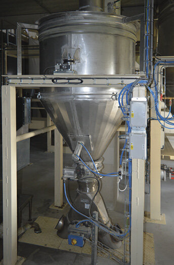 Plynulosť plnenie zaisťujú nerezovej šiestich komorové rotačné podávače Coperion s plne čistiteľným, vyberateľným rotorom. Do predzásobníkov sú nainštalované automatické vzorkovača.
