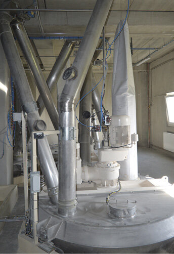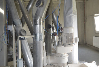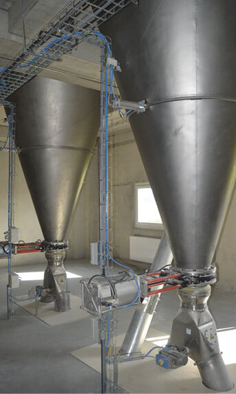 Vypúšťanie materiálu z miešačiek riadi špeciálna nožová šupátka Bickel-Wolf v zosilnenom prevedení z nerezovej ocele. Materiál do zásobníkov potom rozdeľujú symetrické, veľmi tesné, nerezové klapky Jacob.