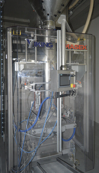 Na plnenie produktov do PE fólií s hmotnosťou 1-5 kg slúži balička Viking Mašek. Balenie tu prebieha plniacim tubusom s vertikálnym šnekom do stočené a zvarené fólie. Hmotnosť balenia je kontrolovaná priebežnou váhou ISHIDA. Výkon baličky je 1 800 kg / hod.