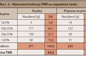 Na obrázku č. 2 sa nachádza preosiata TMR pre kravy v príprave na pôrod. V tejto skupine je cieľom pri vysokej dávke slamy (až do 5 kg) dosiahnuť na hornom site 5–10 % dlhých častíc (tabuľka č. 2). Takto namiešaná TMR nám zabezpečí, že kravy nebudú selektovať predložené krmivo a po otelení budú mať dostatočne naplnený bachor pre dobrý štart do laktácie so zníženým výskytom metabolických porúch. Pridávané väčšie množstvo slamy spôsobí vzostup sušiny TMR s oddeľovaním jednotlivých zložiek a v takom prípade je možné použiť vodu na zabránenie separovania z dôvodu vysokej sušiny takto namiešanej TMR.