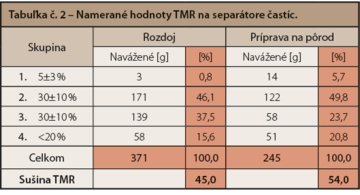 4. Pri poklese alebo nadbytku dlhých častíc (malých častíc) je potrebné skontrolovať údaje z datatransféru o čase miešania a o naložení požadovaného množstva krmiva do voza, sledovať homogenitu vykladanej hmoty TMR na začiatku a na konci kŕmneho stola.